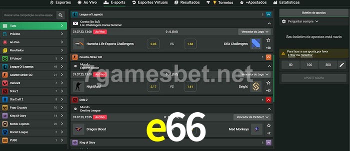 O e66 oferece uma grande seleção de opções de apostas em e-sports com probabilidades competitivas